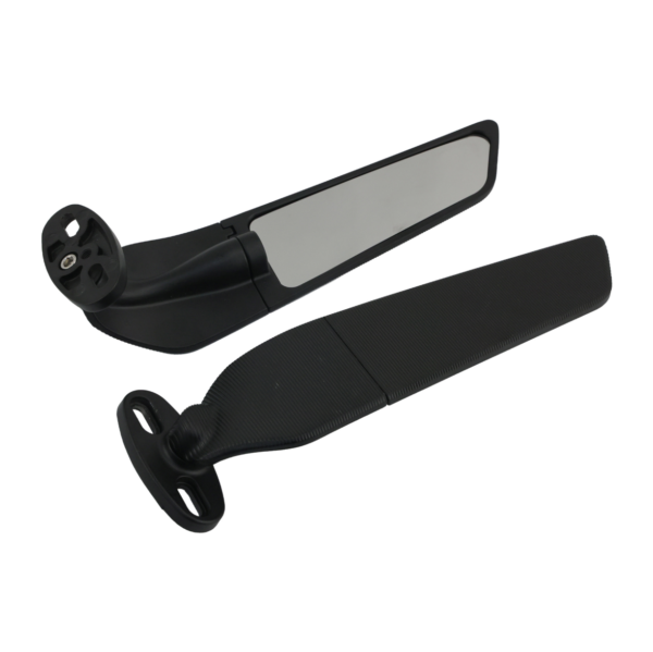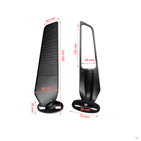 Espejos retrovisores para moto Universales, Tipo alerón corto 265mm, base 2 tornillos, color negro.